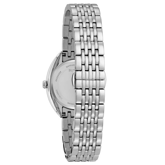 Questo orologio Bulova fa parte della Collezione Classica. In questa versione troviamo il Bulova da donna con cassa curva in acciaio inox, 24 diamanti incastonati a mano individualmente sulla cassa e sul quadrante argentato bianco, vetro zaffiro curvato, bracciale in acciaio inox con chiusura a doppio pulsante.
