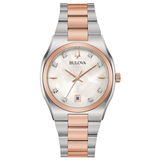 Orologio donna Bulova Classic Surveyor solo tempo, quadrante madreperla bianco e cinturino in acciaio bicolore. Indici con Diamanti. Garanzia 5 anni.