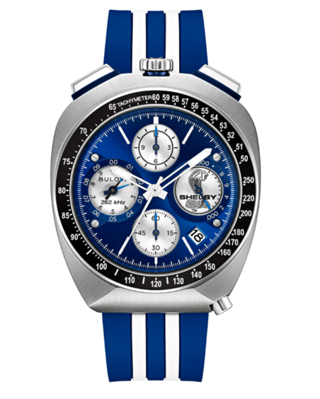 Orologio Bulova Uomo Crono Racer 150th Anniversary Limited Edition con 7.500 esemplari al mondo. Bulova riconquista una parte delle sue radici legate al mondo della corsa e per consolidare questo passaggio apre ad una collaborazione con casa Shelby, fondata da Carroll Shelby, protagonista dell’orgoglio americano nelle auto da competizione negli anni ’70. Cassa di forma «bullhead» in acciaio con finiture lucide e satinate alternate. Lunetta e pulsanti cronografici con riferimenti blu. Dimensione 43 per 14,2 di spessore. Quadrante blu multistrato lavorato soleil con contatori in color argento su un livello inferiore. Dots e indici come le lancette in bianco con super luminova. A ore 3 contatore con il logo icona della casa Shelby. Tra ore 4 e 5 il datario. Cinturino in gomma altamente qualitativa HNBR realizzato a strisce bianche e blu a ripresa dei colori della famosa auto GT500 con fibbia deployante. Fondello a 4 viti con inserto in vetro dove alloggia il logo dei 150 anni Bulova, la firma ed il logo di Shelby — indicazione della Limited Edition.