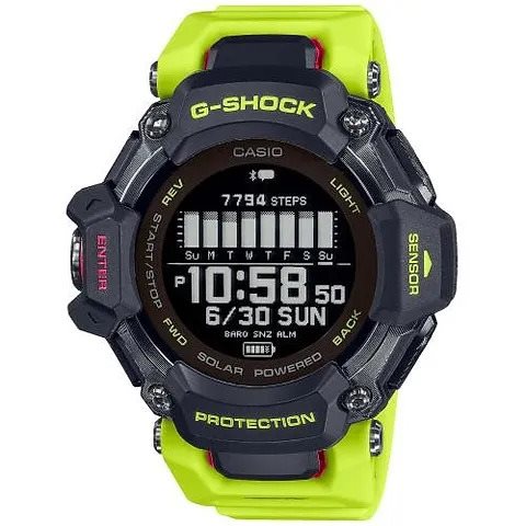 Andate oltre con il G-SQUAD GBD-H2000, una gamma di orologi multisport G-SHOCK con cardiofrequenzimetro e GPS. Questo orologio è ricco di funzioni per monitorare tutti i tipi di allenamento. Misurate la frequenza cardiaca con il sensore ottico, utilizzate l'accelerometro per contare i passi o per fare una nuotata. I sensori possono accedere alla libreria dello Smartwatch Polar per analizzare l'allenamento e il livello di recupero dopo il sonno. Che si corra, si vada in bicicletta o si nuoti, questo orologio è indispensabile e vi equipaggia perfettamente per qualsiasi sport. Il cinturino è realizzato in plastica a biomassa di mais, prodotta da materiali organici rinnovabili. Ricaricatelo tramite USB o energia solare e restate in forma!