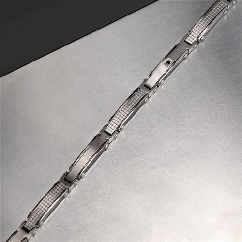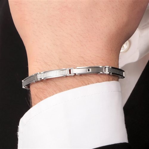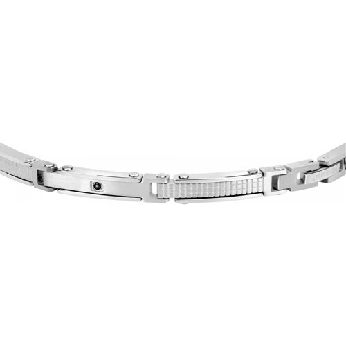 Bracciale uomo , acciaio 316L , lunghezza cm 20 regolabile fino a cm 17 , maglie satinate e zigrinate , zircone nero incastonato. Immagine indicativa , la confezione può variare di forma e colore , confezione e garanzia originali.